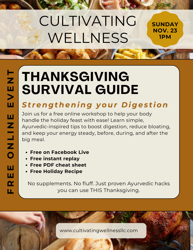 Join us for a free online workshop to help your body handle the holiday feast with ease! Learn simple, Ayurvedic-inspired tips to boost digestion, reduce bloating, and keep your energy steady, before, during, and after the big meal.